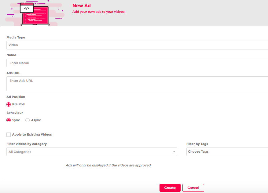 Through the + Ad button you will access the area where you can load your ads and associate them with your videos.