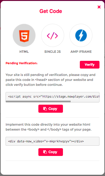 script src="//mowplayer.com/watch/js/ v-mg4uezf6z7g .js"></script>Keep in mind : Even if your site is not verified, (but enabled) you can still use Mowplayer but that it is not the recommended implementation and we will not be able to enable the full potential of monetization under this method.